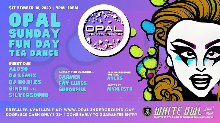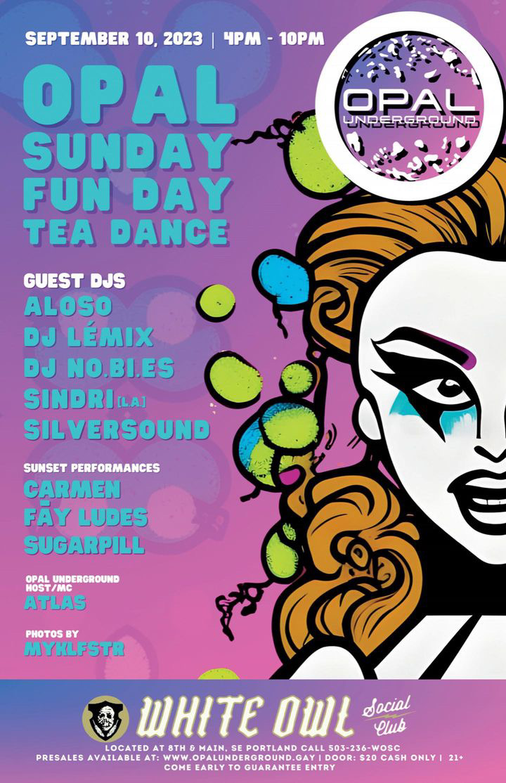 THE VIBE & SOUND: Opal Underground’s continuing the Sunday tradition that is all about putting the cell phone down and getting up on the dance floor on the expansive open air patio of White Owl Social Club. The DJs and Performers will be uplifting us all by sharing their craft and passion to move our bodies. Let’s come together and celebrate the ending of the magic of Portland summers with a party that uplifts Portland’s vibrant queer community. Incredible DJs, from up and down the West Coast, will bring heat with their cuts of disco and house music and encourage sweaty sęxy togetherness on the dance floor. PLUS, let’s not forget our Drag Performers!!! They will be serving it at Sunset so don’t forget to show them your appreciation for the art they create by showering them with TIPS.