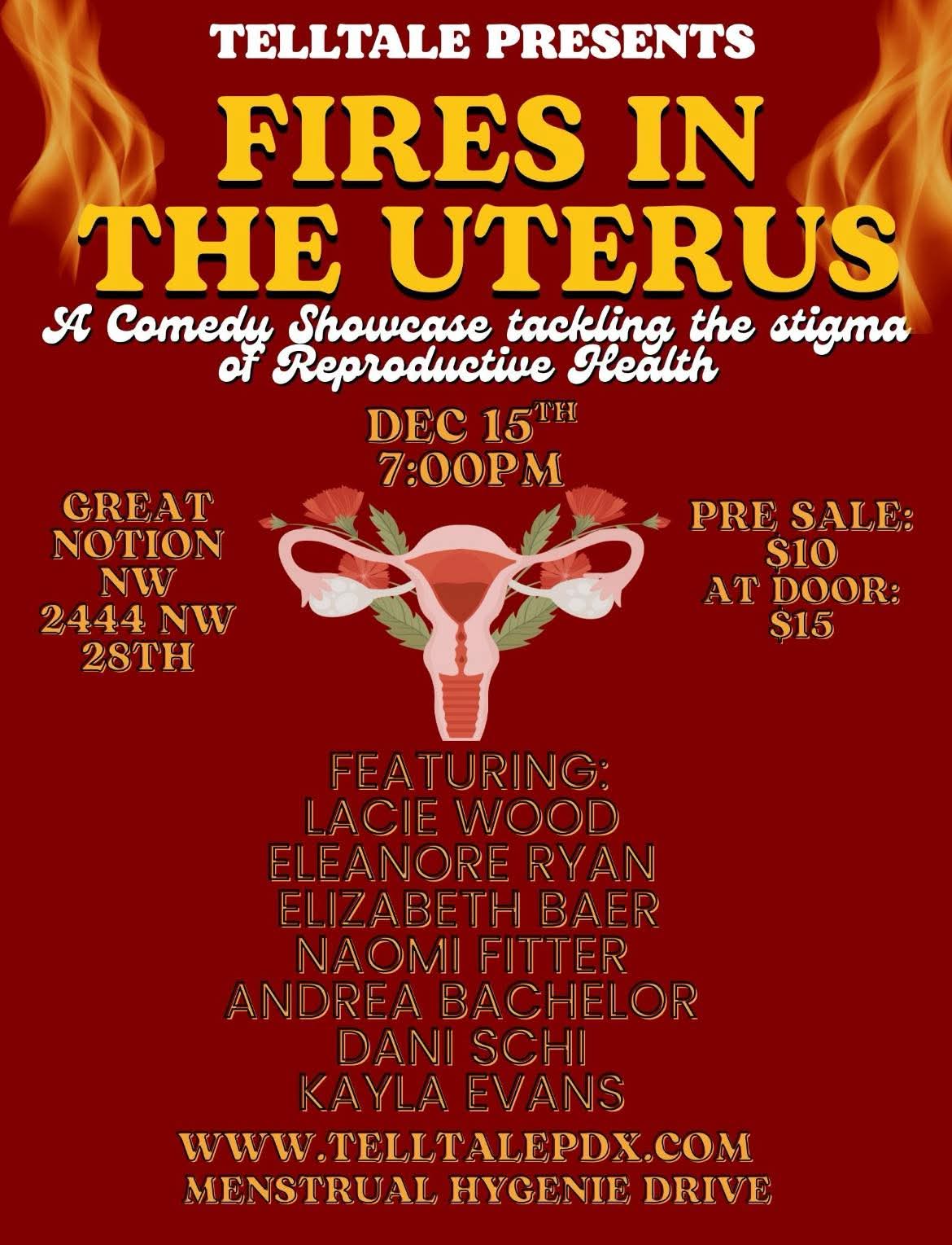 Please join us for "Fires In The Uterus", a comedy showcase that tackles the stigma of reproductive health. Comics will bring stories and jokes about their lived experience and normalize talking about important things that often get silenced.