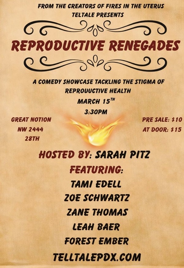 Telltale Presents "Reproductive Renegades", a comedy and storytelling showcase that tackles the stigma of reproductive health. Comics will bring stories and jokes about their lived experience and normalize talking about important things that often get silenced. Get ready to laugh, feel seen, and to hear jokes about stuff you.... might not be used to.