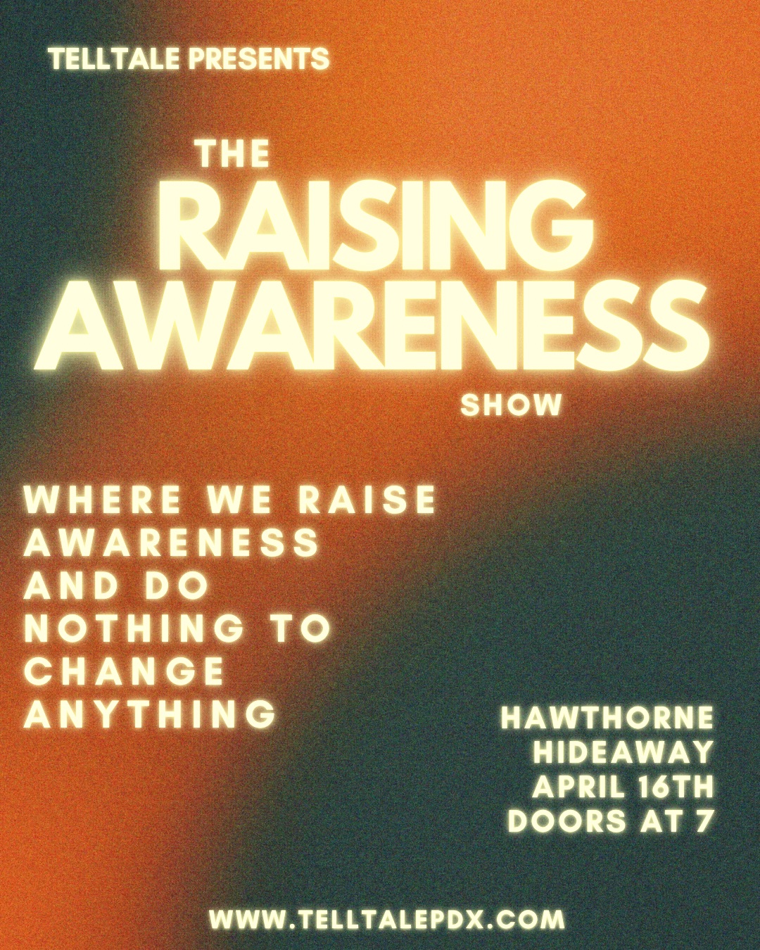 This month's theme is "Raising Awareness"—where each performer will pick a topic to raise awareness about, but do absolutely nothing to change it, because we are being cheeky about performative activism stuff, and just want to have fun tonight raising awareness about very silly things. There will be a raffle, with the proceeds going to feed the hosts a burger, because again—we are being cheeky, we often donate the money.