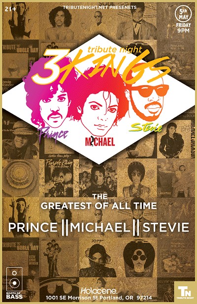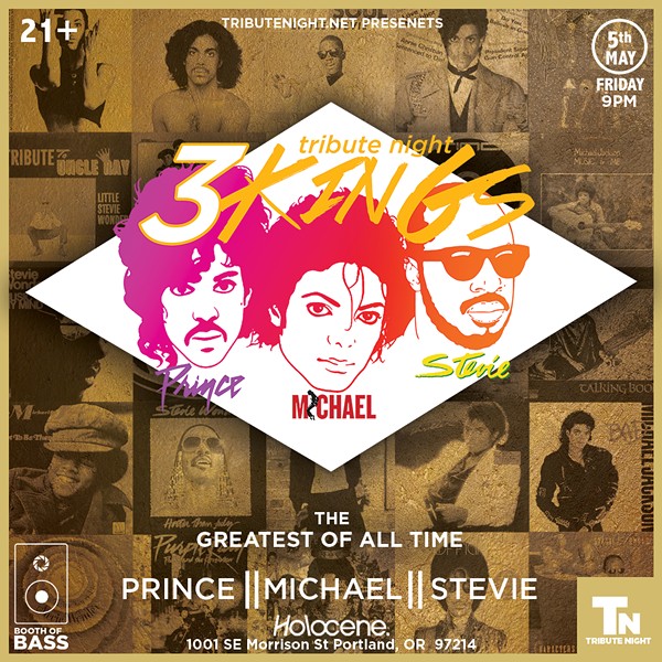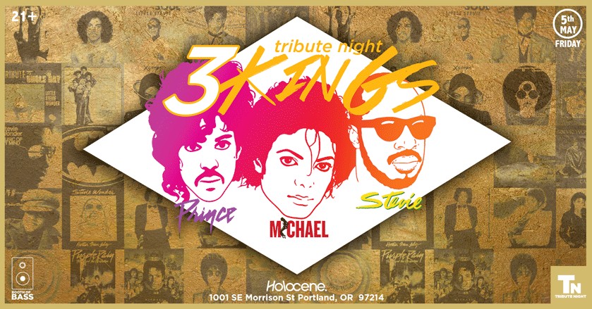 TributeNight.net presents 3 Kings a truly special occasion, celebrating the lives of the three most influential music artists of all time. Portland pays tribute to the 3 Kings of music Prince, Michael Jackson, and Stevie Wonder. We will have Music Videos and movies playing all throughout the night along the walls of Holocene, as well as a free photo booth provided by Booth of Base as well as a Snapchat filter to commemorate tonight.